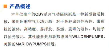產(chǎn)品特點:本單位生產(chǎn)的QBY QBK系列氣動隔膜泵是一種新型輸送機械,采用壓縮空氣為動力源,對于各種腐蝕性液體,帶顆粒的液體,高粘度、易揮發(fā)、易燃、劇毒的液體,均能予以抽光吸盡。
